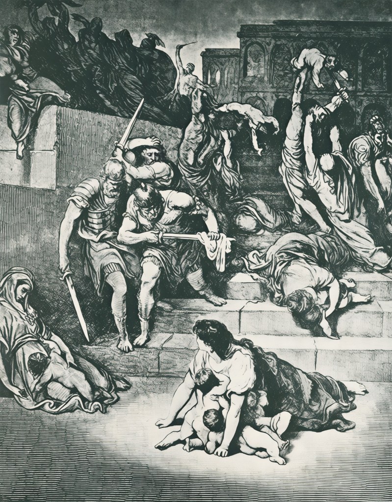 «Тогда Ирод, увидев себя осмеянным волхвами, весьма разгневался и послал избить всех младенцев в Вифлееме и во всех пределах его, от двух лет и ниже, по времени, которое выведал от волхвов. Тогда сбылось реченное чрез пророка Иеремию, который говорит: глас в Раме слышан, плач и рыдание, и вопль великий: Рахиль плачет о детях своих и не хочет утешиться, ибо их нет». Мф. 2:16–18