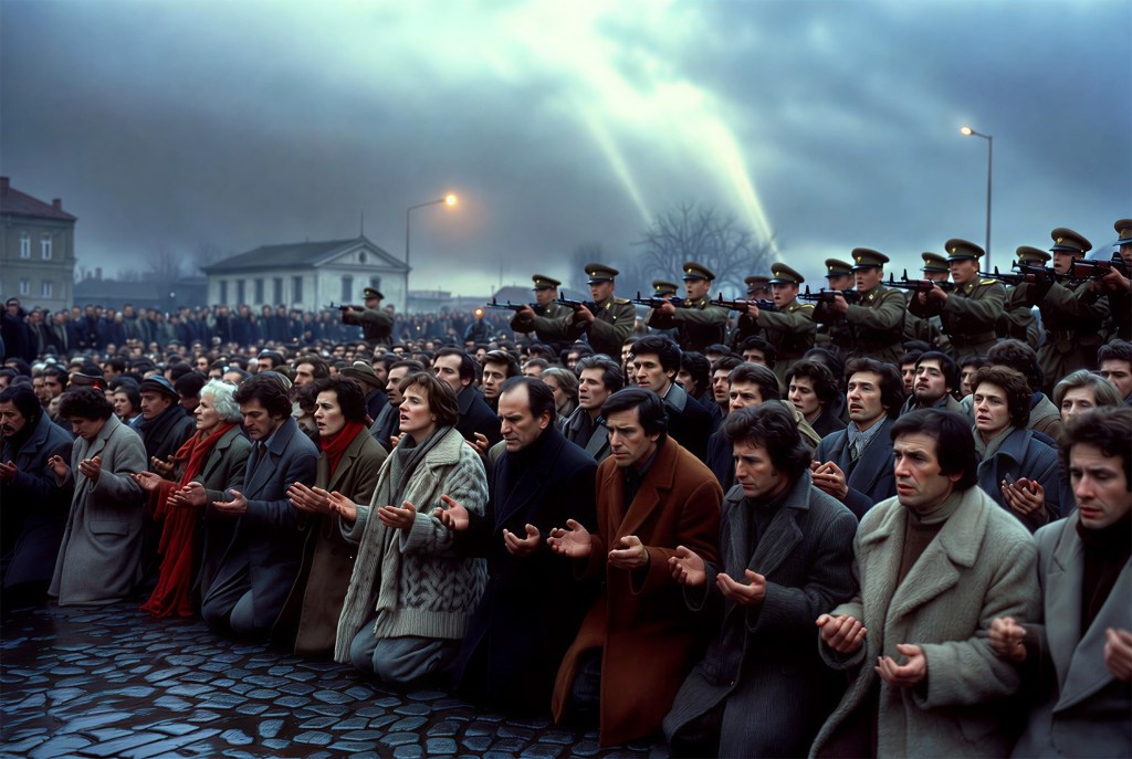 Солдаты открыли огонь, было много убитых и раненых. Затем произошло нечто удивительное. Вся толпа вместо того, чтобы сопротивляться солдатам, одновременно преклонила колени и обратилась к Богу в молитве. Потрясённые солдаты отказались стрелять.