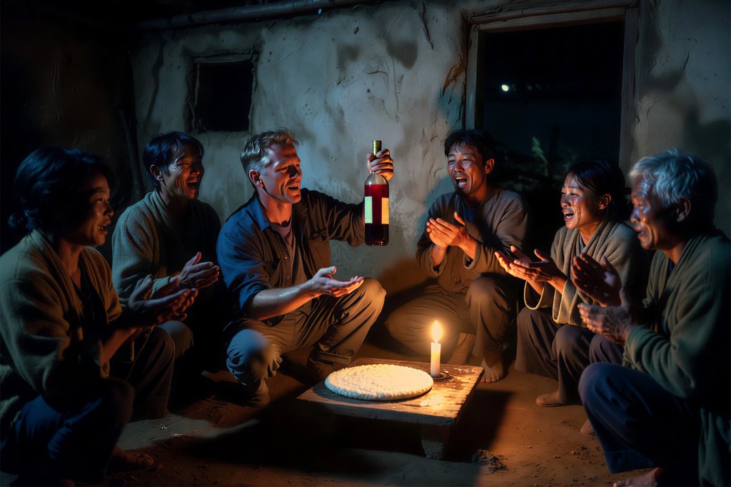 Тут он вспомнил о друге, сказавшем, что его «подарок» пригодится в нужную минуту. Он быстро схватил сумку и вытащил свёрток. В нём была бутылка вина. Все поселяне заплакали, восхваляя Бога за этот своевременный подарок.