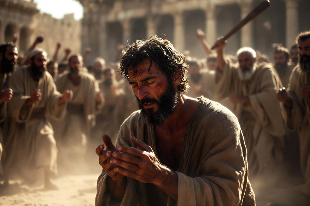 Тогда книжники и фарисеи взяли камни и начали побивать его. Под градом камней Иаков повторял: «Господи, прости им, ибо они не ведают, что творят». В толпе также начали поднимать камни, чтобы бросить их в Иакова.